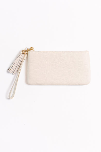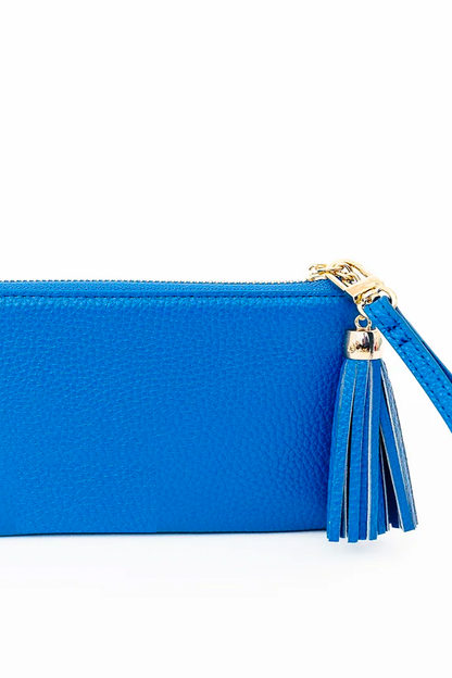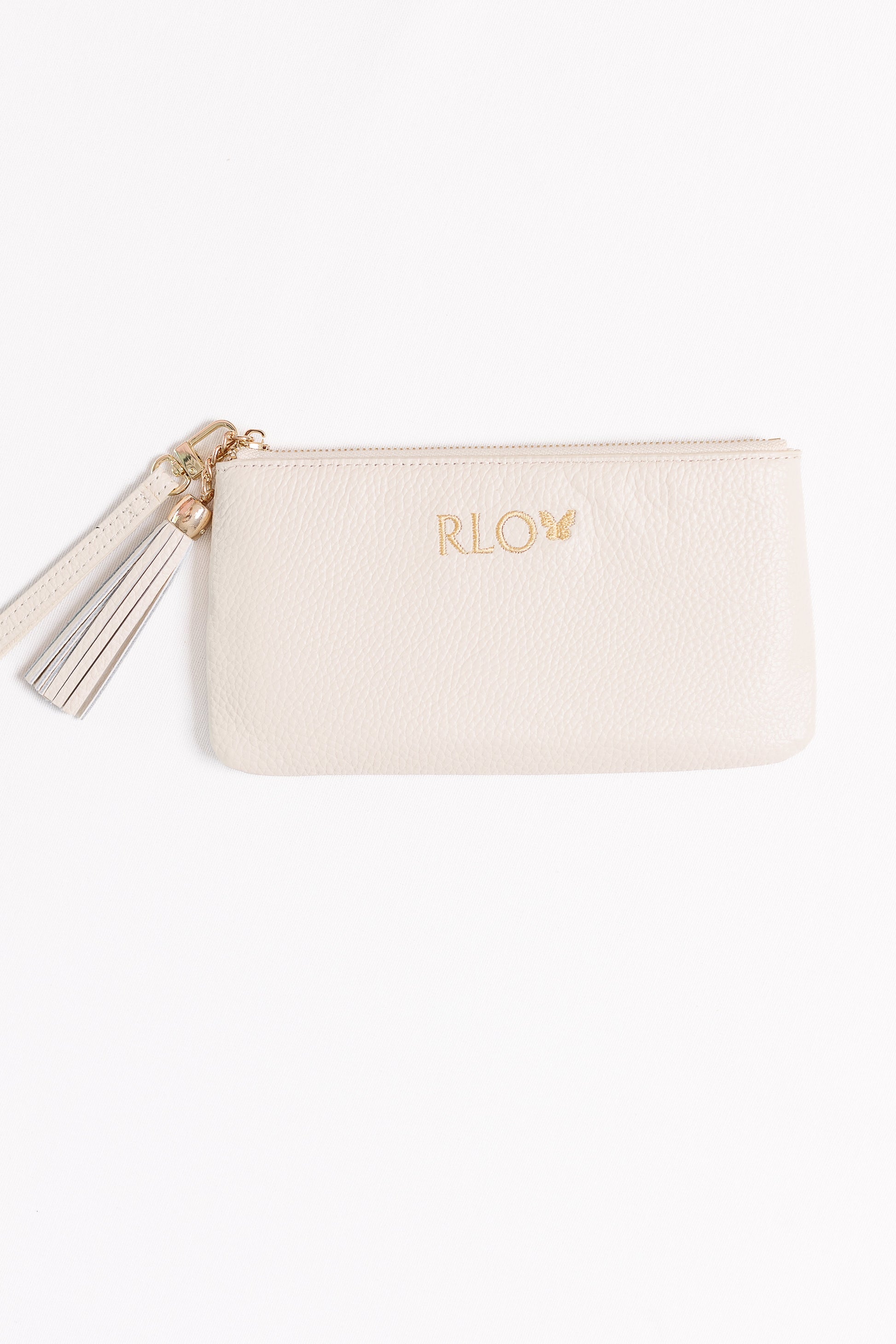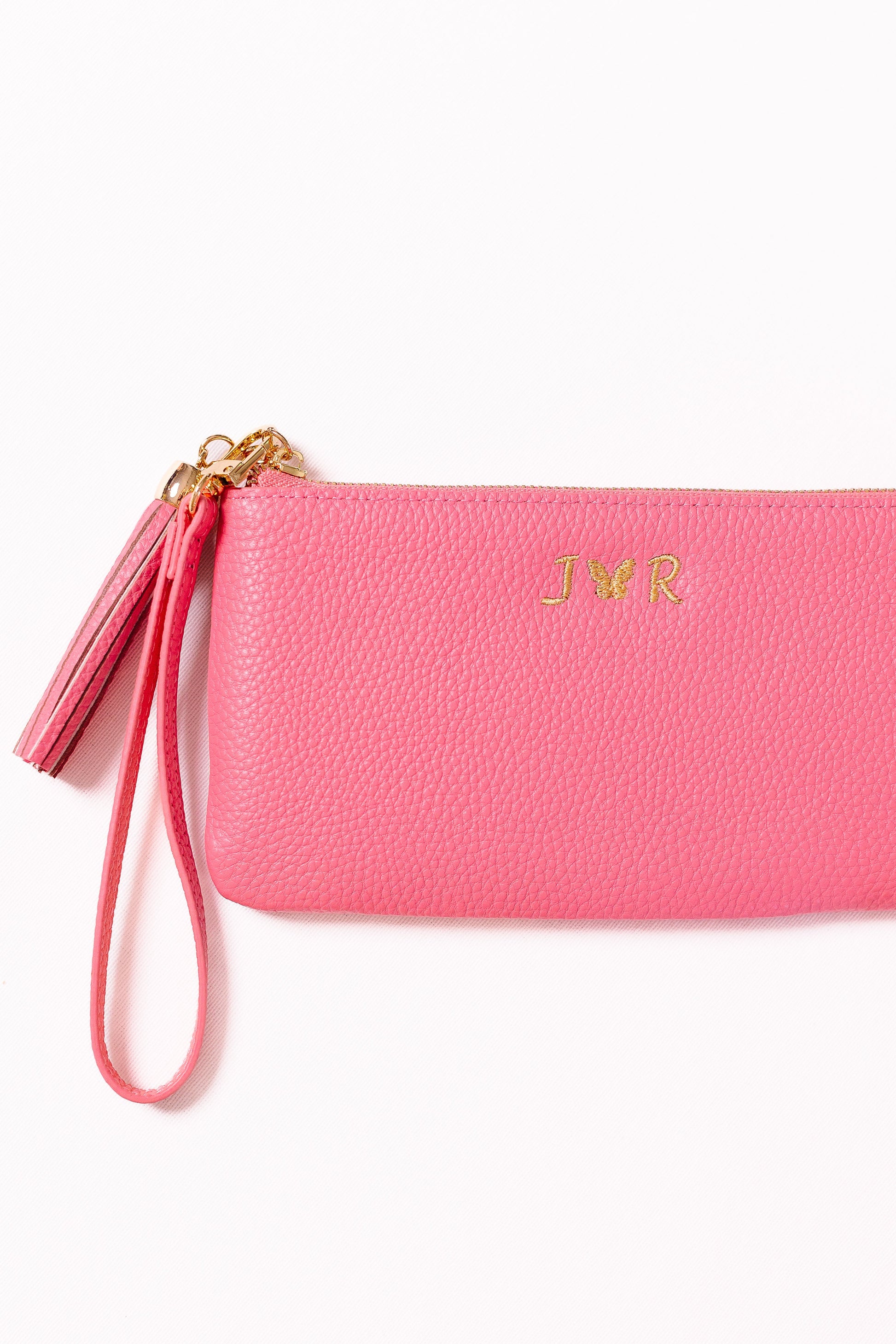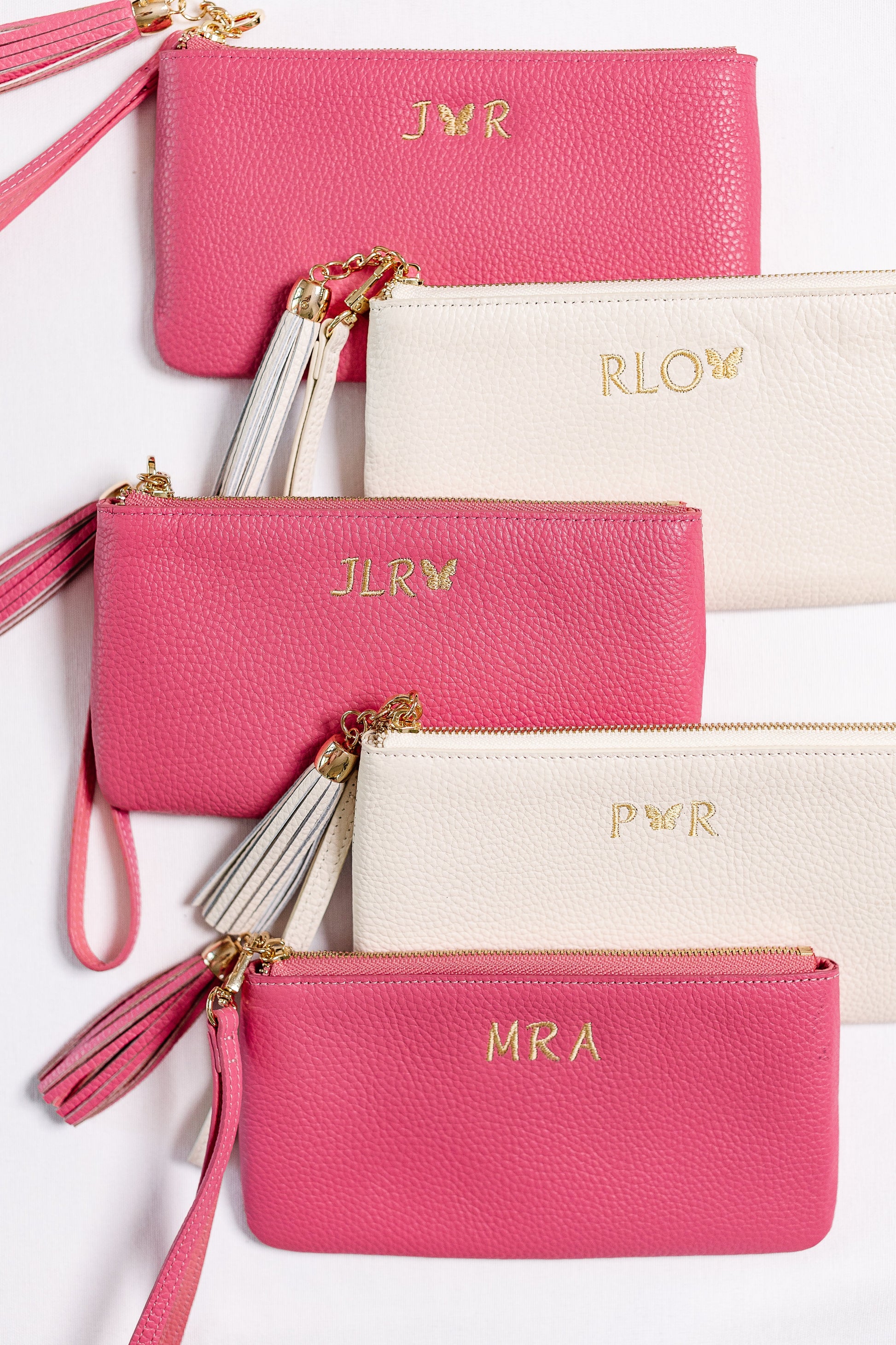 This leather wristlet is ideal for carrying both your extra mahjong accessories or daily essentials when traveling light. The wristlet has a gold zipper closure, wrist strap and matching tassel and is offered in either a neutral cream, bright pink, or a bright blue soft pebbled leather. The wristlet is beautiful as is or you can customize with you monogram.