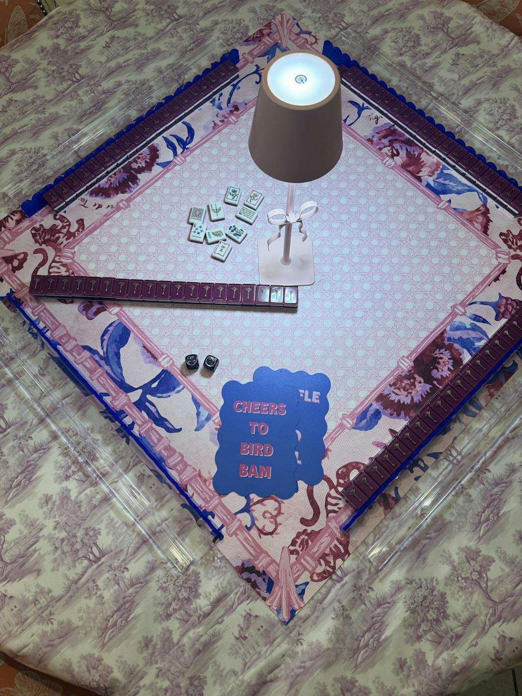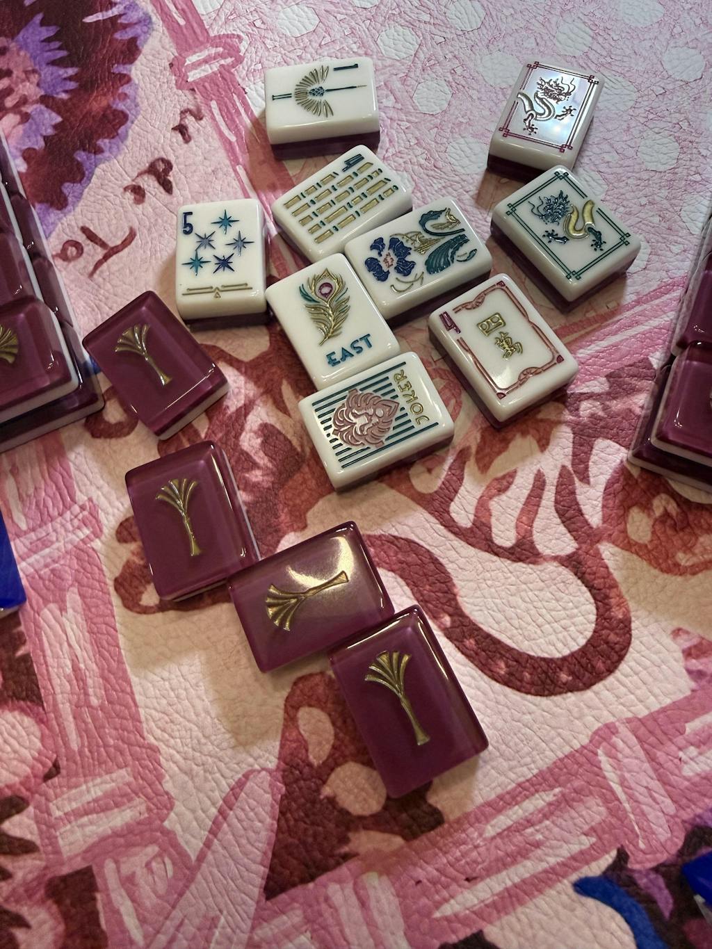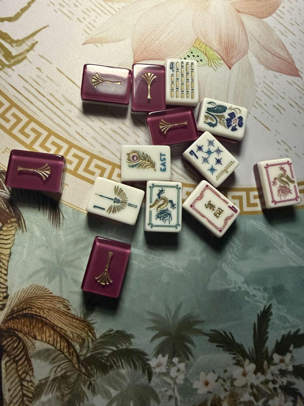 The tile set comes with a two-tone color-block velvet tile bag OR you can upgrade to a custom sized lucite display box that is just the right size for this beautiful set for an additional $20. Each tile set comes with two dice and a tile guide that shows all of the tile designs on one side and some things to remember about the game of mahjong on the other side, just in case you need a quick refresh.Â