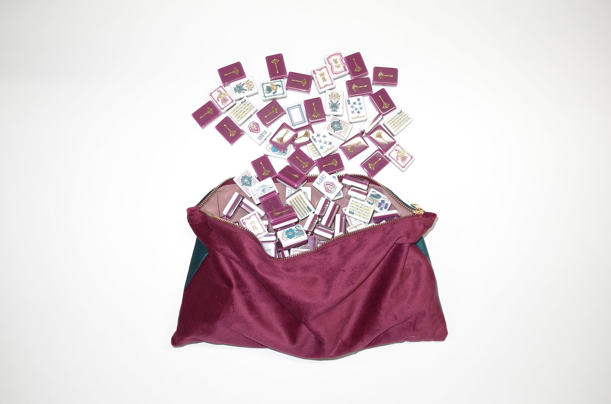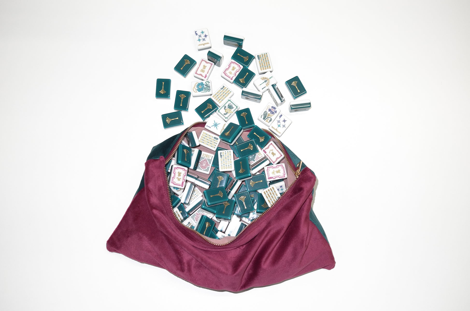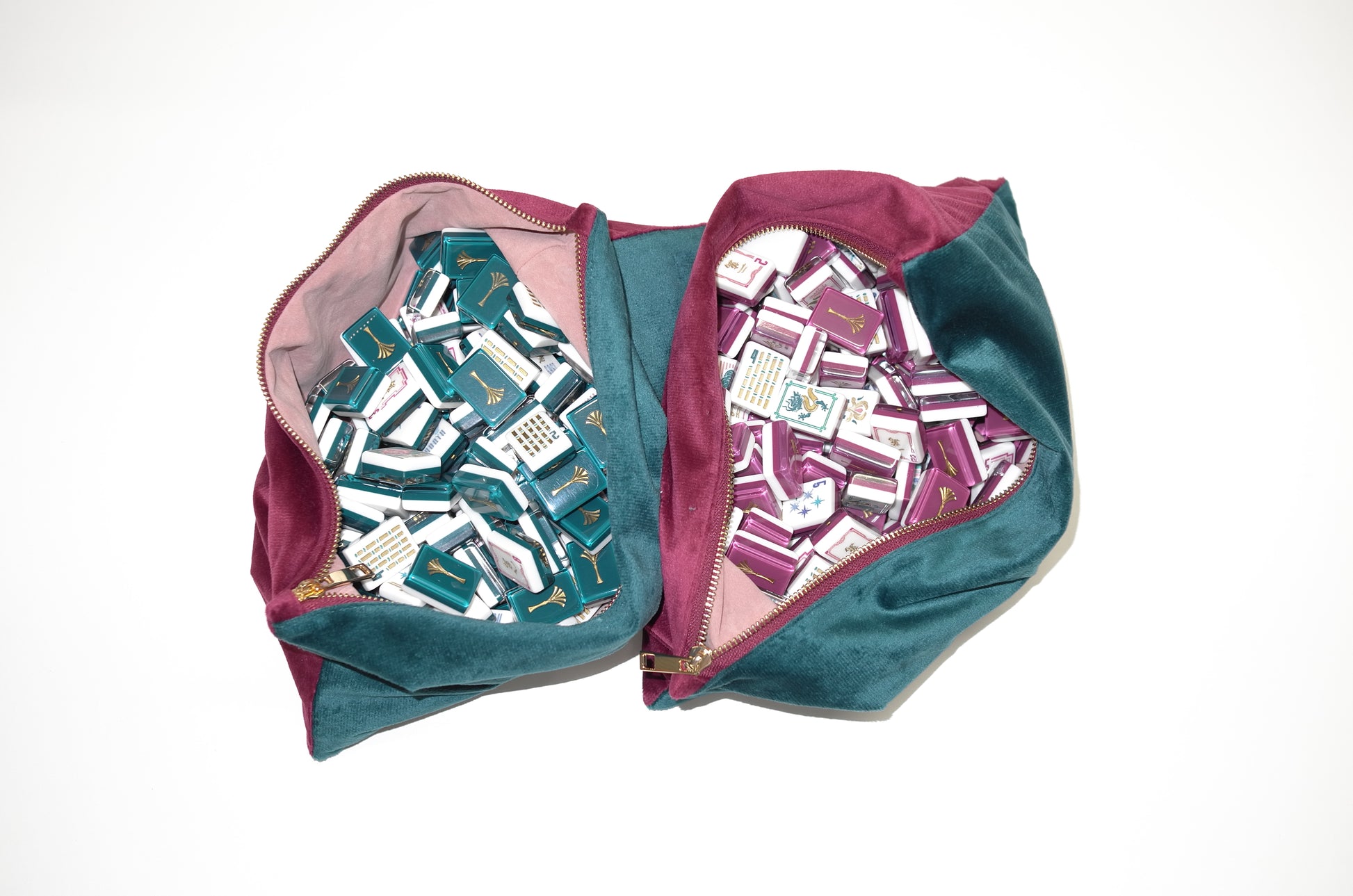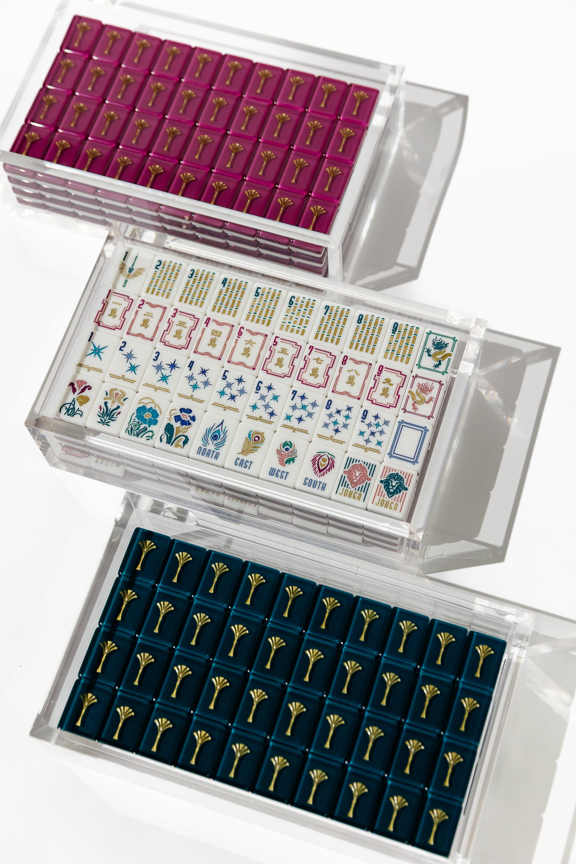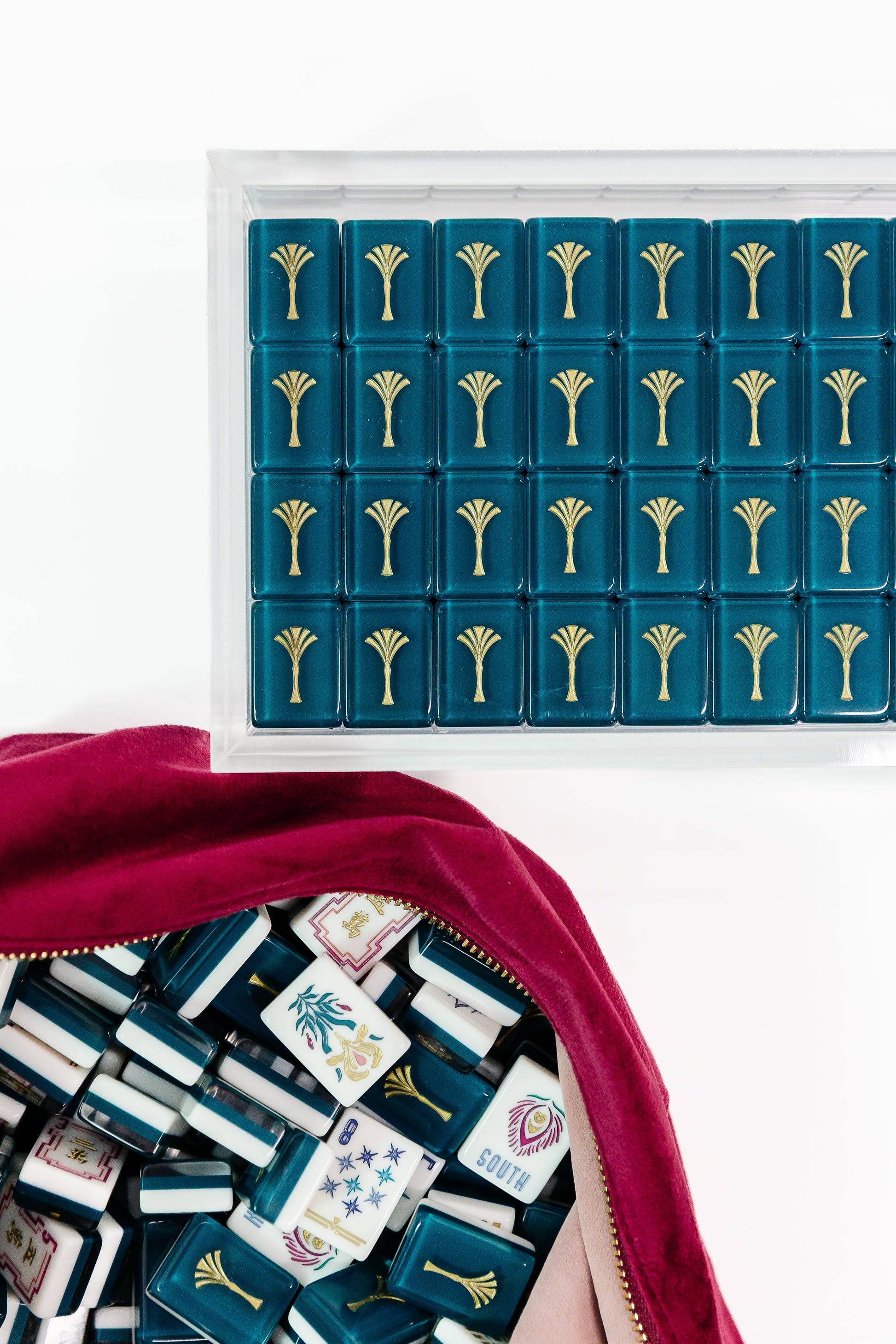The tile set comes with a two tone color-block velvet tile bag OR you can upgrade to a custom sized lucite display box that is just the right size for this beautiful set for an additional $15. Each tile set comes with two dice and a tile guide that shows all of the tile designs on one side and some things to remember about the game of mahjong on the other side, just in case you need a quick refresh.