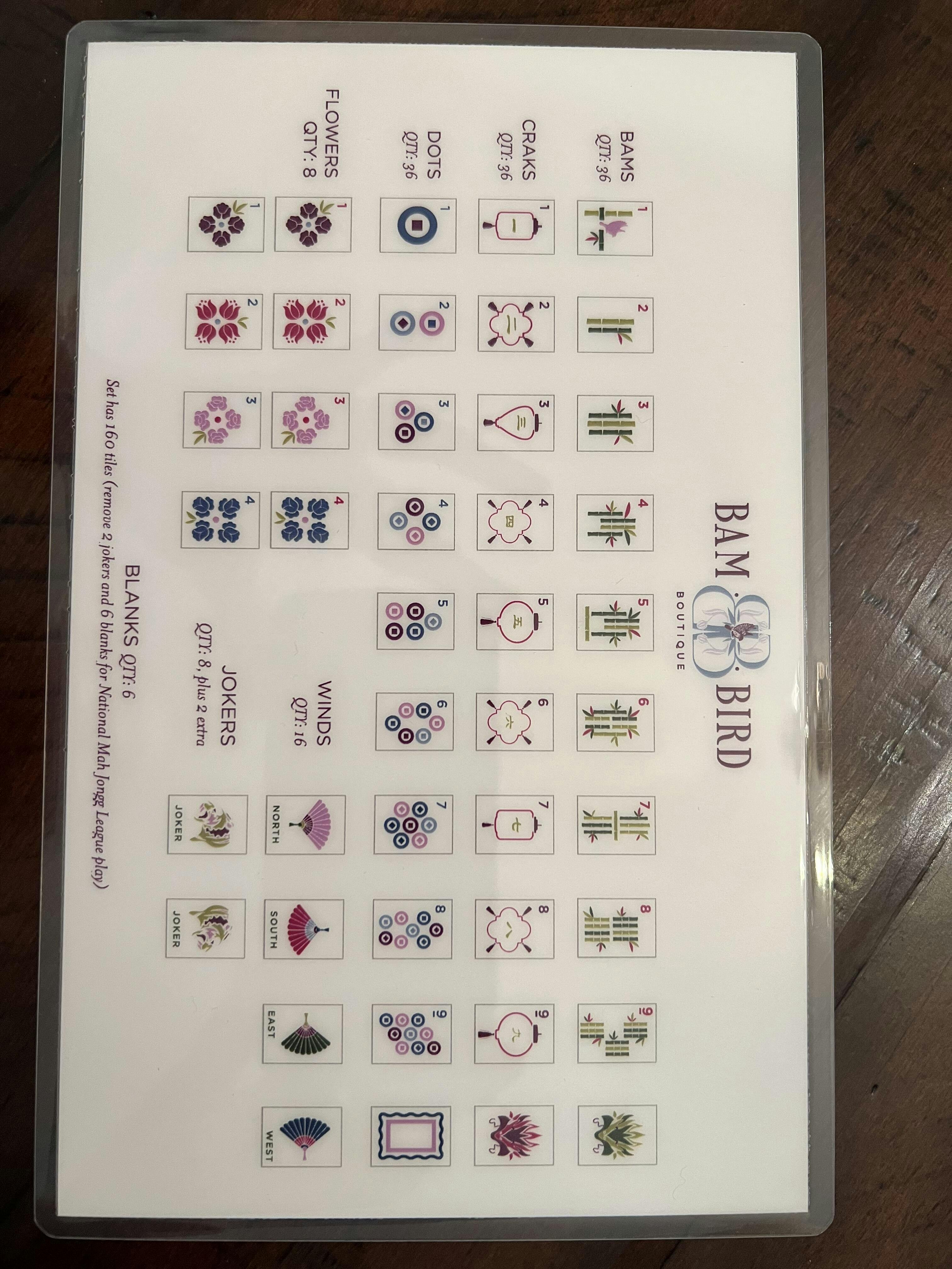 The tile set comes with your choice of a custom sized lucite display box that is just the right size for this beautiful set OR a two tone color-block velvet tile bag. Each tile set comes with two dice and a tile guide that shows all of the tile designs on one side and some things to remember about the game of mahjong on the other side, just in case you need a quick refresh.Â