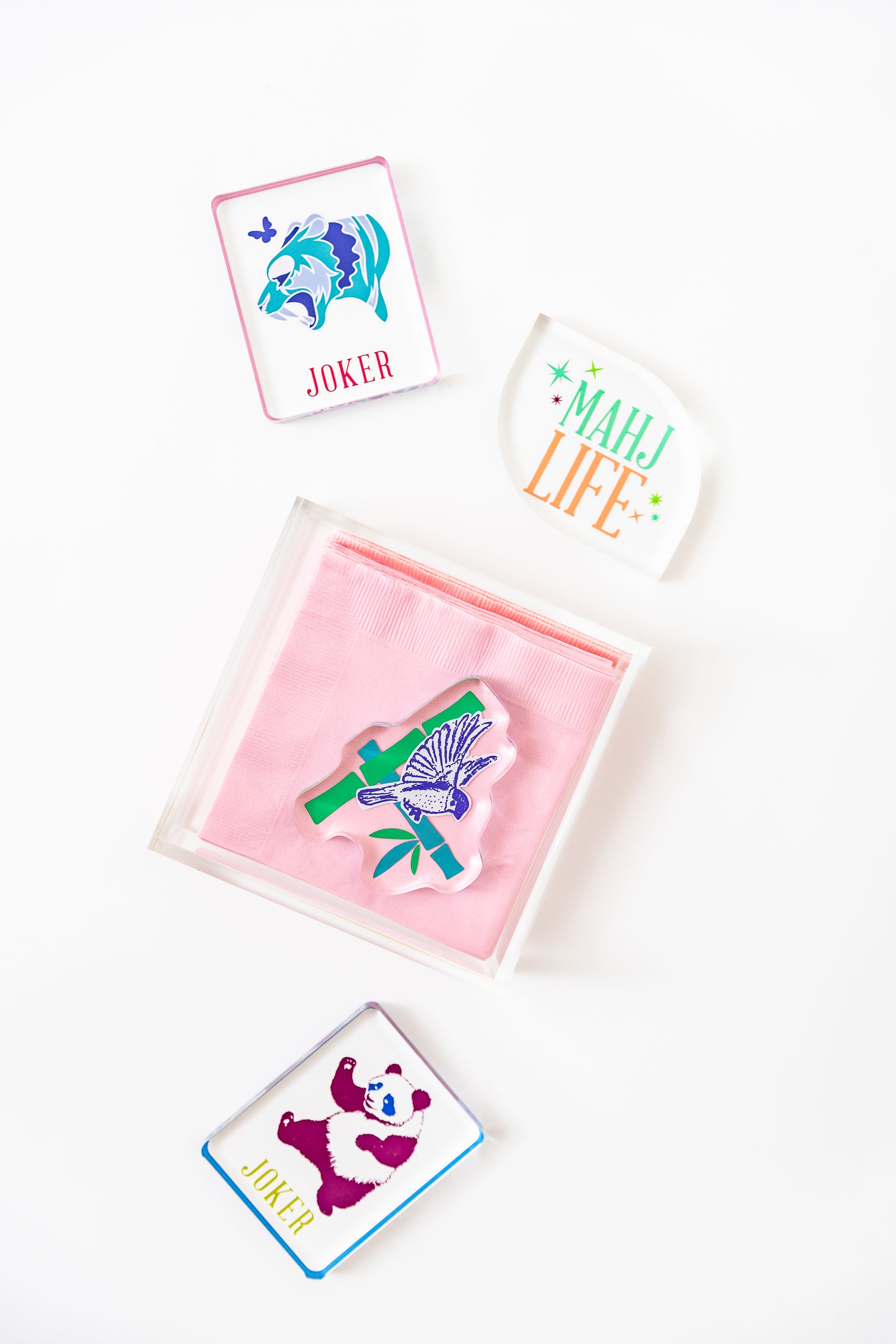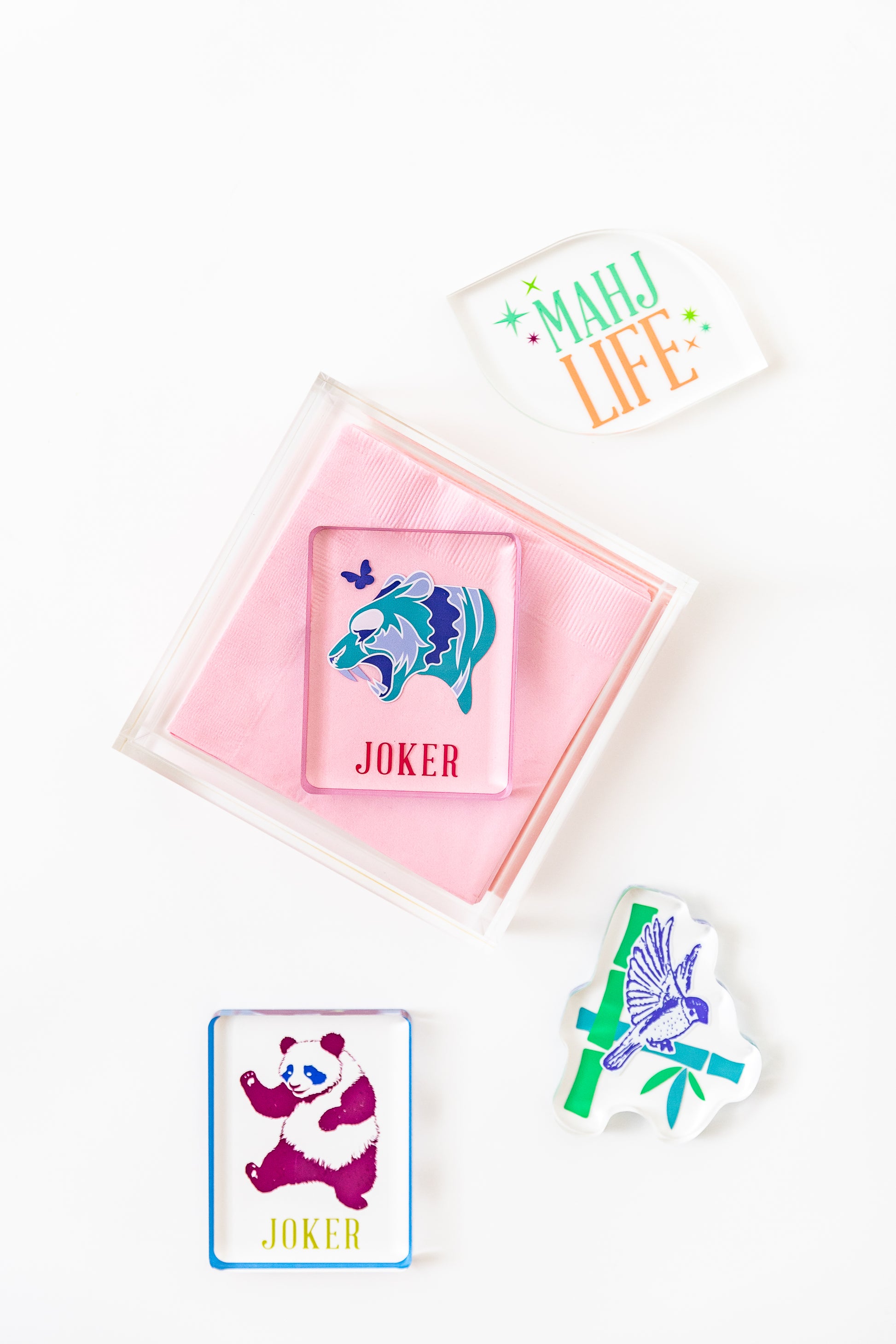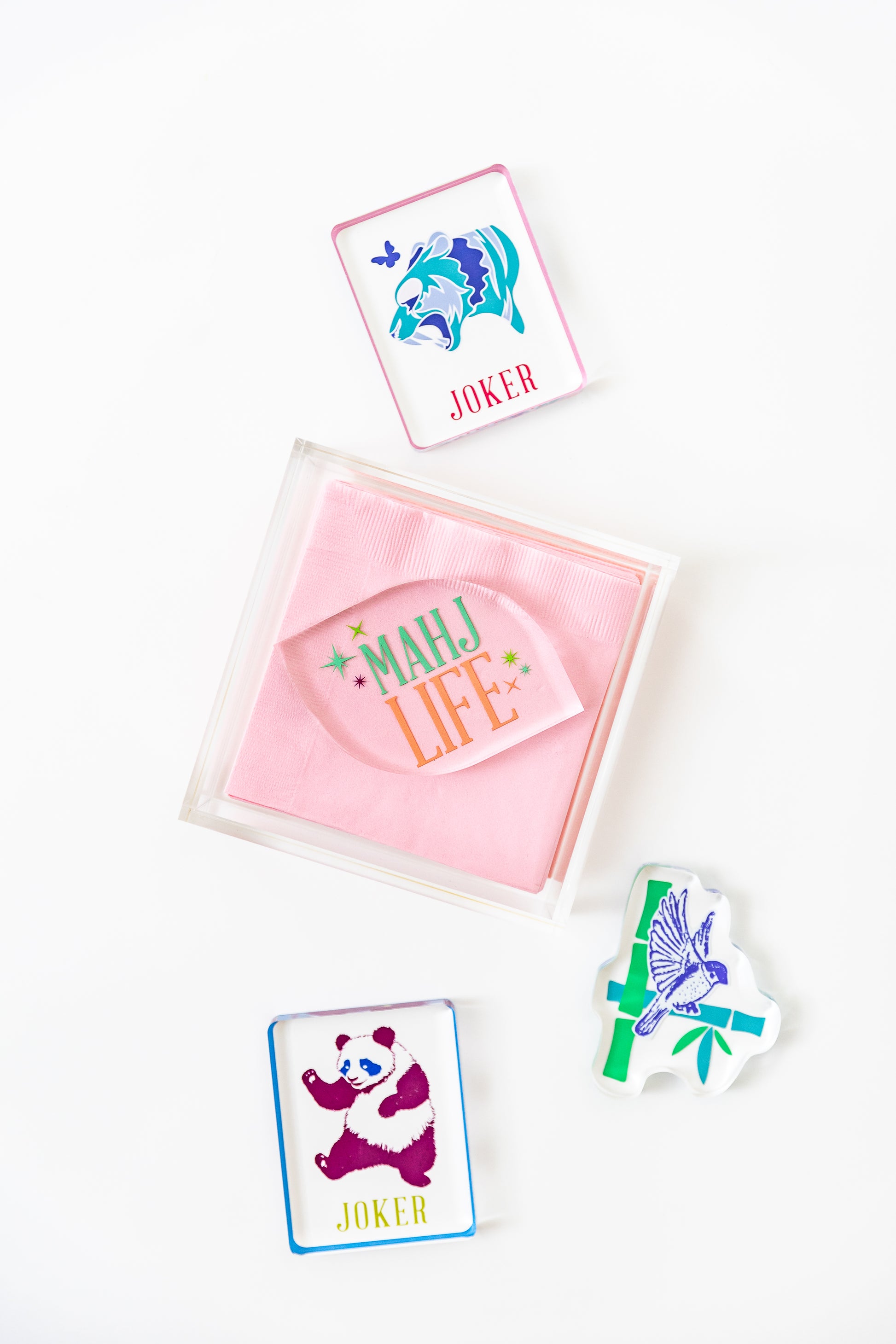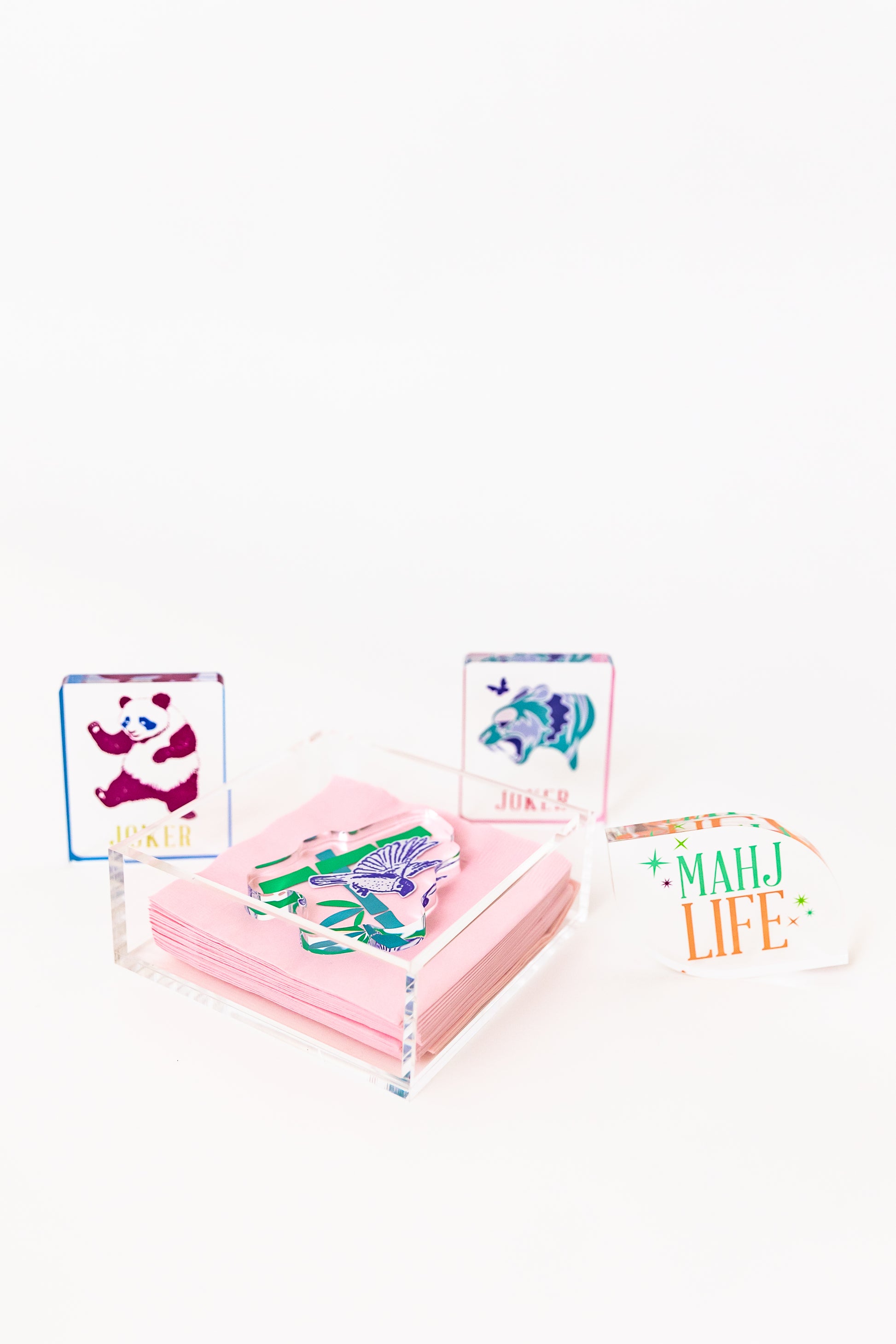 Such a clean, elegant box to fill with your favorite Mah Jongg cocktail napkins. The joker paper weight adds the perfect touch. And keeps your napkins in place for MJ Al Fresco!