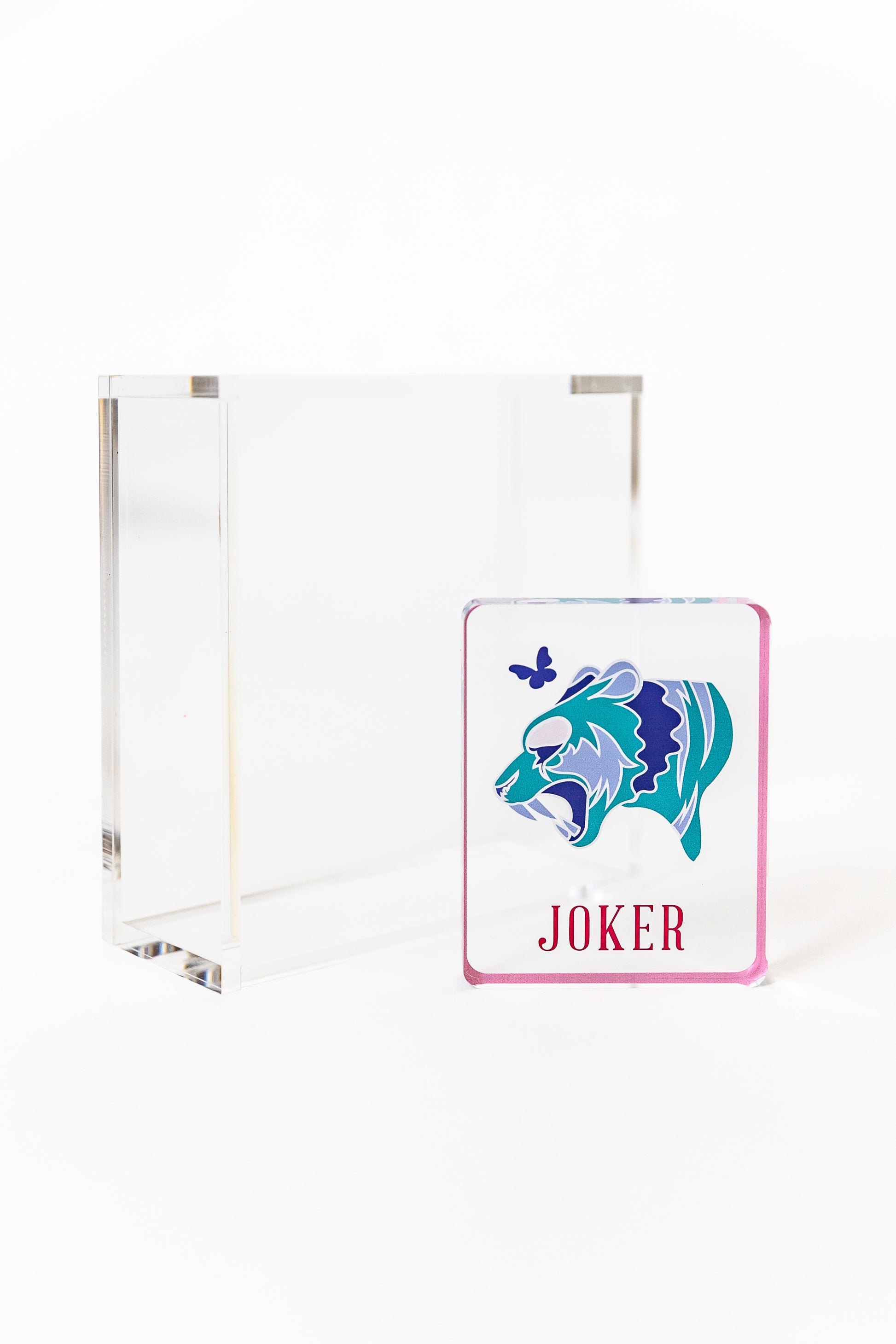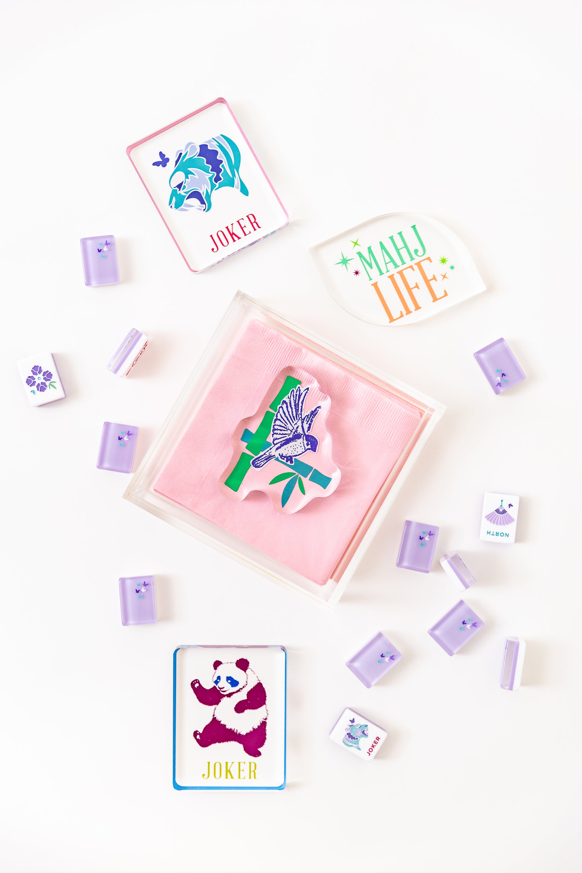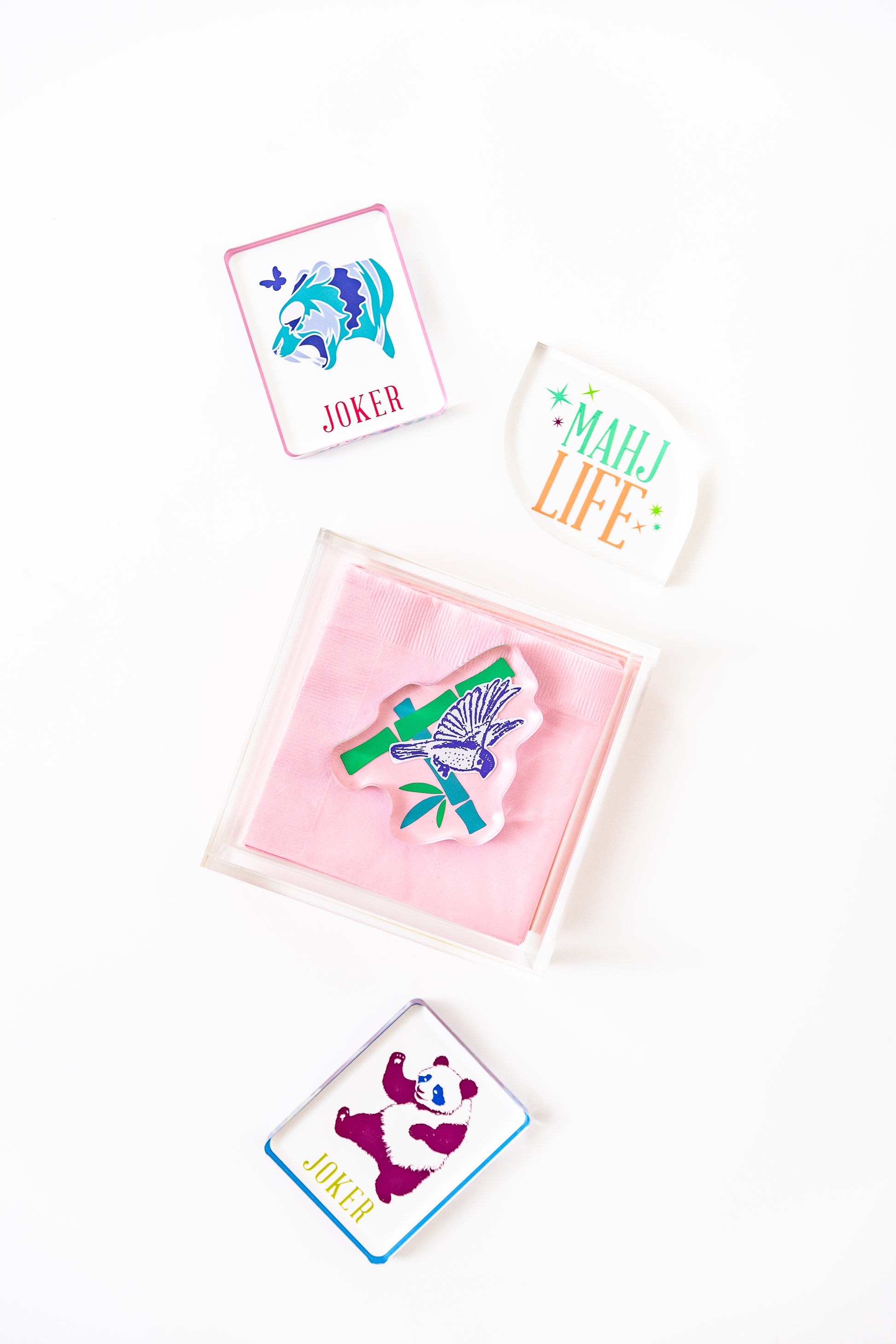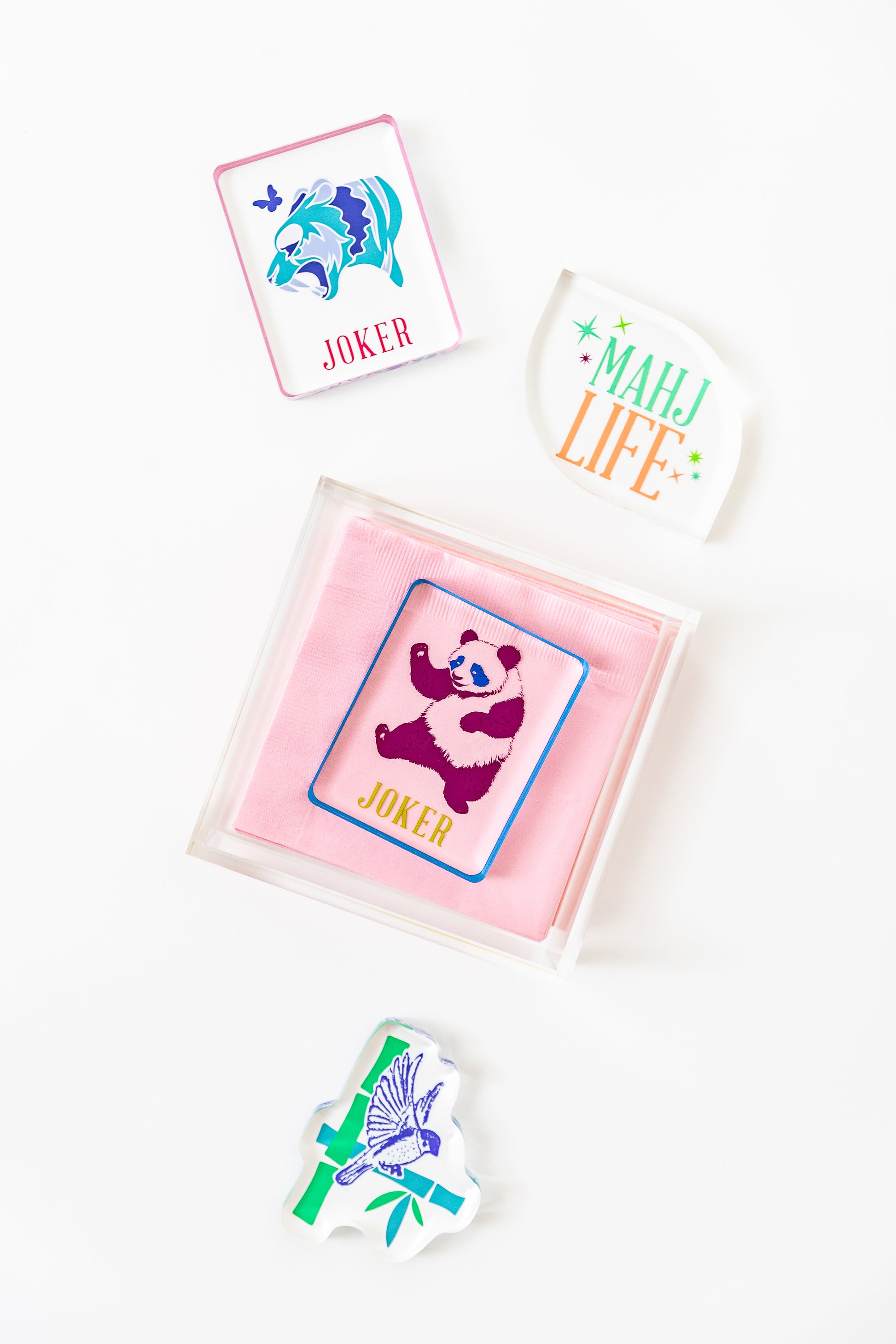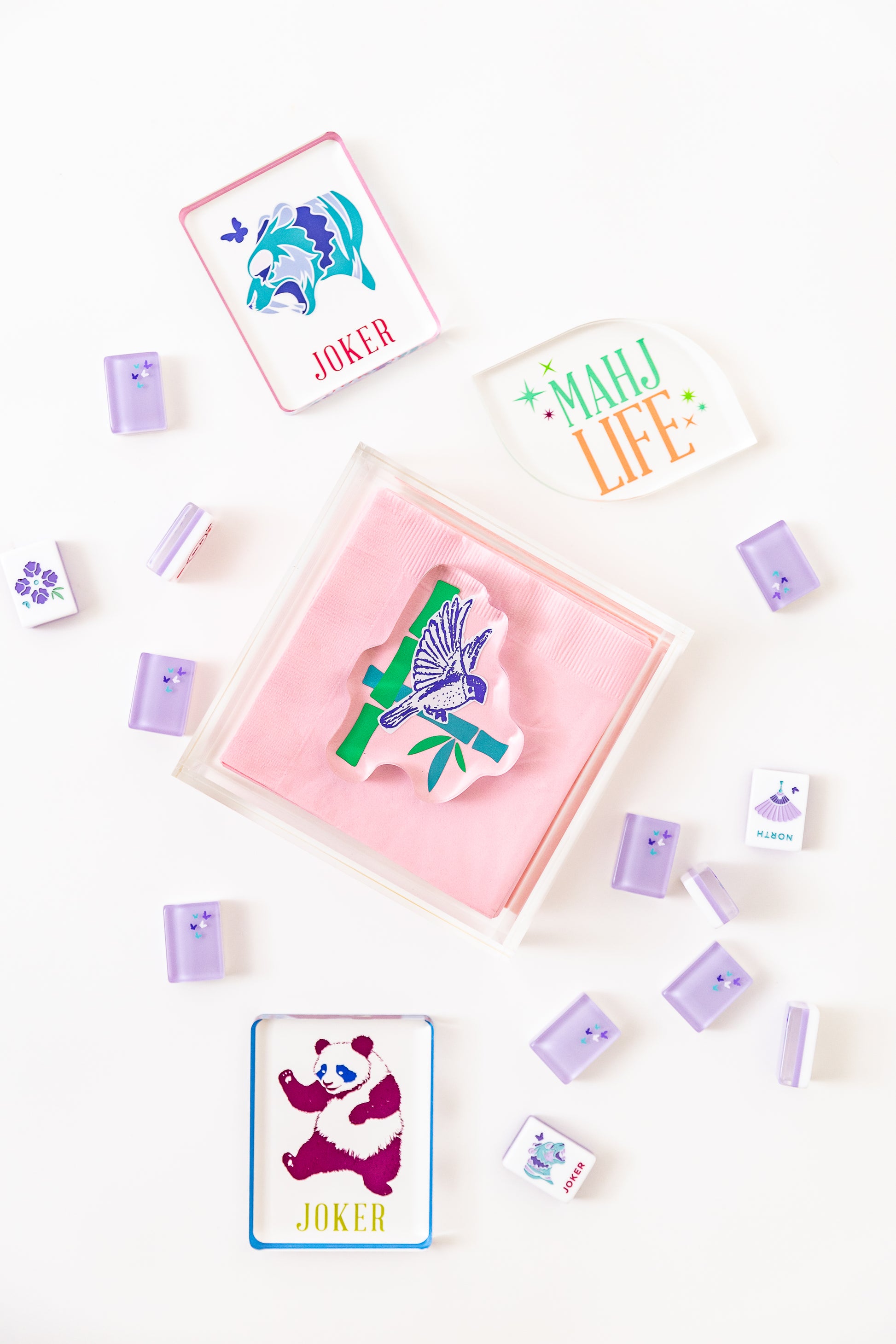 Such a clean, elegant box to fill with your favorite Mah Jongg cocktail napkins. The joker paper weight adds the perfect touch. And keeps your napkins in place for MJ Al Fresco!