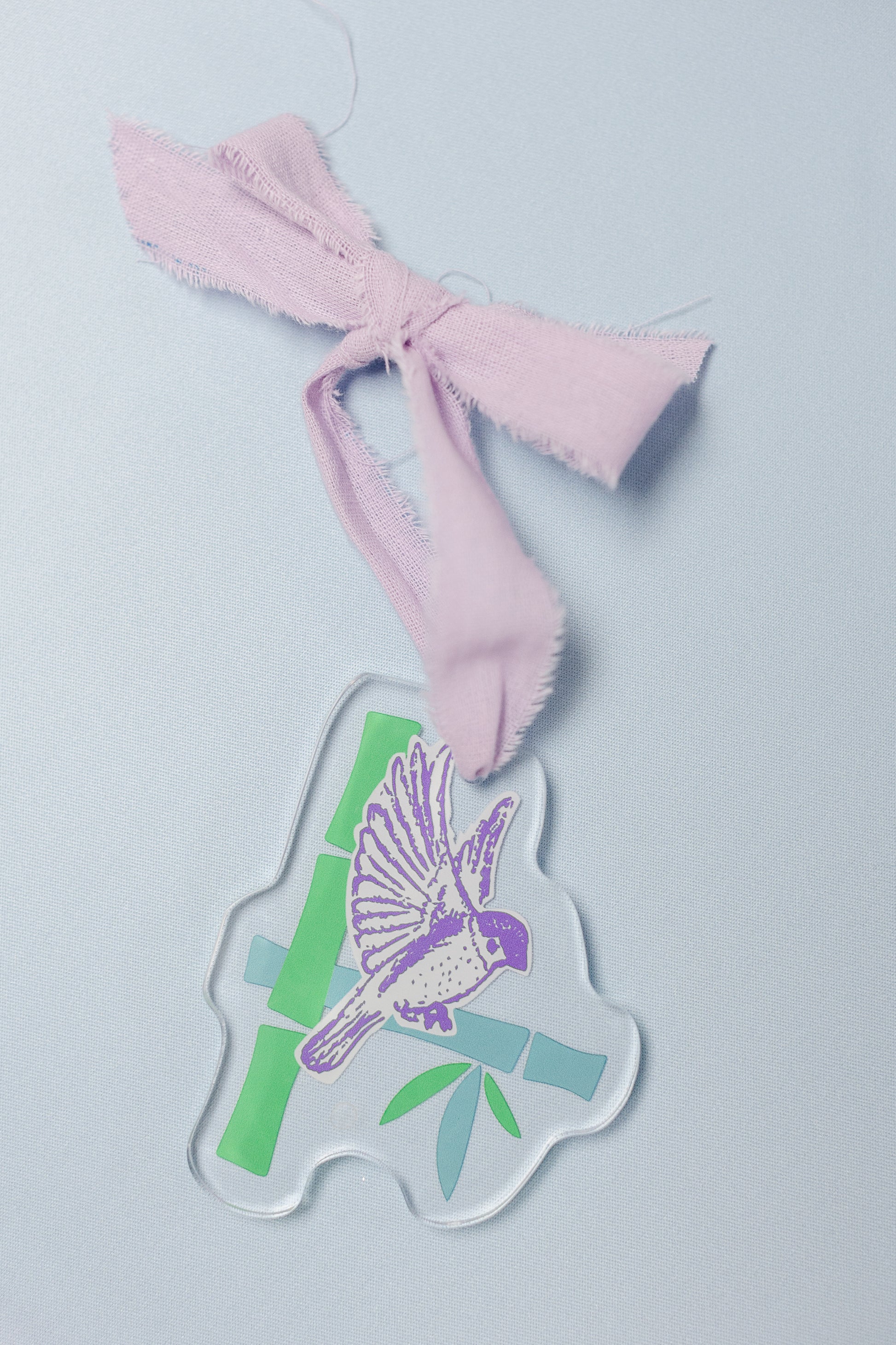 Bam Bird Ornament measures 3.75"x3" and 8mm thick
