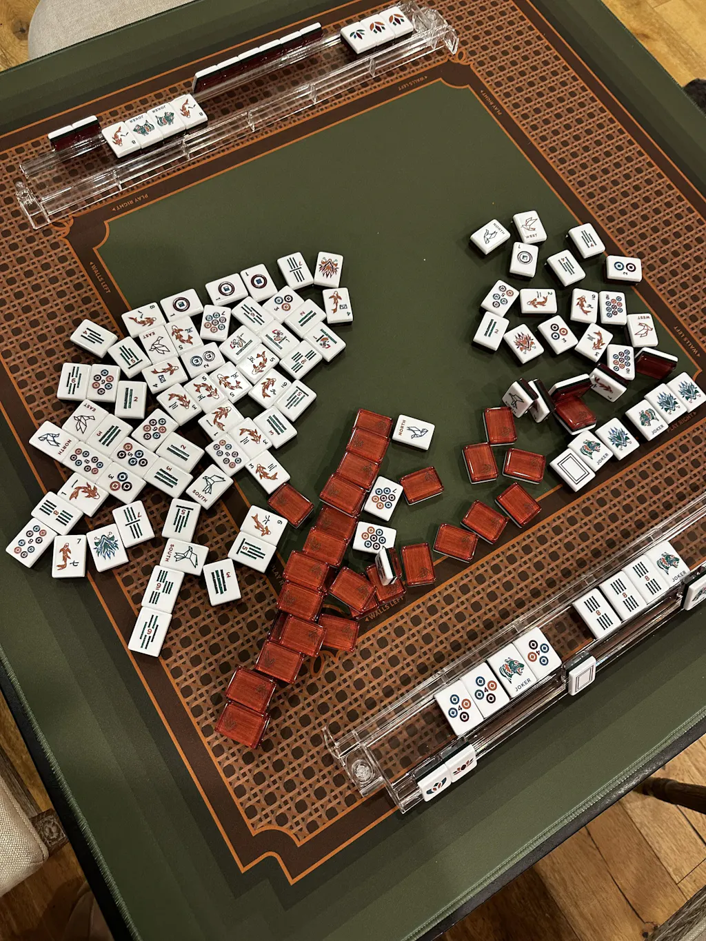 - 160 tiles (36 bams, 36 craks, 36 dots, 8 flowers, 16 winds, 12 dragons, 10 jokers, 6 blanks). Remove 2 jokers and 6 blanks for National Mah Jongg League play.